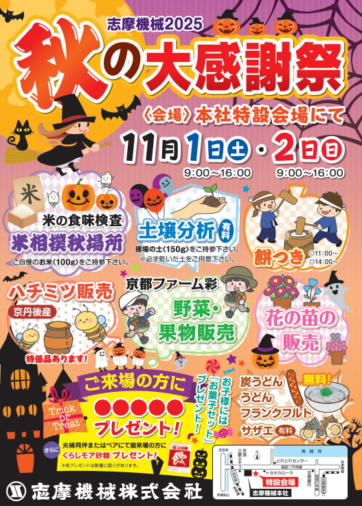 会場では農業の専門家として、皆様のニーズに応える商品をご提案します。また、お客様がお使いの機械の修理やメンテナンスも承りますので、お気軽にご相談ください。詳細はチラシに記載されていますので、ぜひご家族でお越しください!