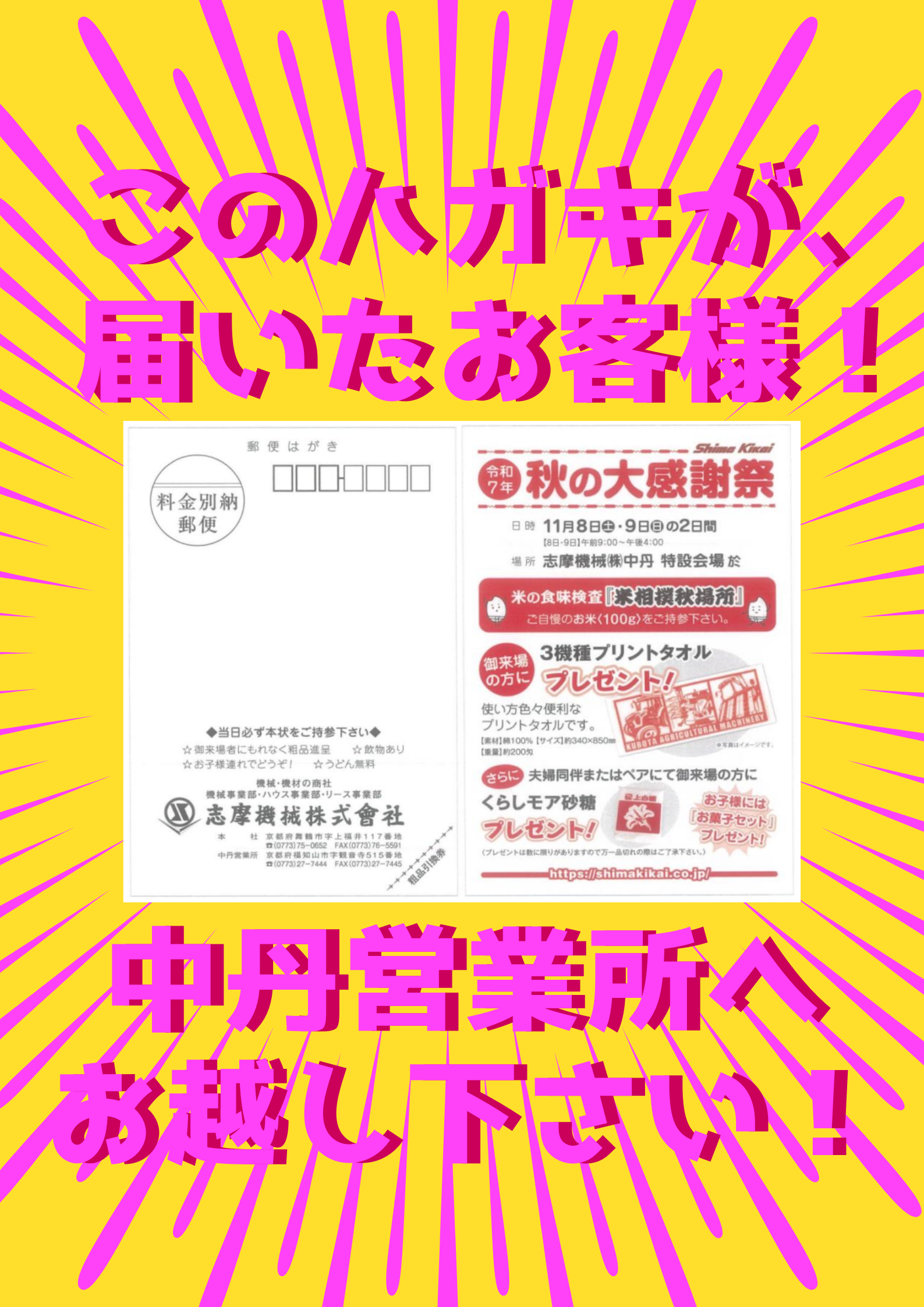 福知山エリアでは、11月8日(土)・9日(日)の2日間、【秋の大感謝祭】を開催します。福知山エリアの感謝祭では、これからの季節に欠かせない農業機械やスマート農業を目指した農業用ドローン等も多数展示します。農業のプロとして、皆様のお役に立てるような商品を提案させていただきます。またお客様がご使用されている大切な機械の修理や整備依頼についてもお受けしておりますので、なんなりとお申し付けください。