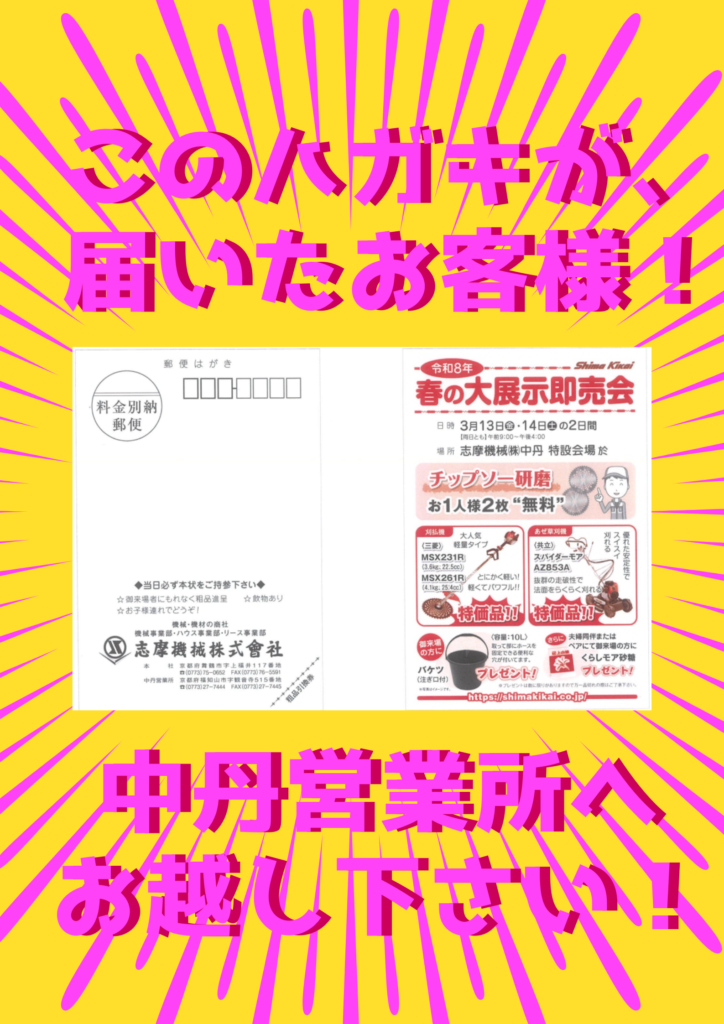 尚、今回の福知山エリアの展示会はご来場特典として、粗品の進呈に併せて、ご夫婦同伴の来場の方にはお砂糖もお渡しします。これからの草刈シーズンに必須となります、草刈機のチップソーの研磨を、おひとり様2枚まで無料でさせて頂きます。ぜひご家族揃ってご来場くださいませ!